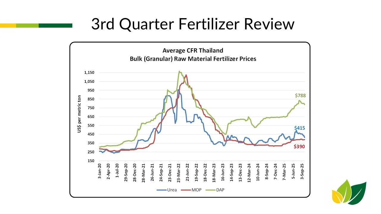 Urea prices dropped 13% to $415 CFR in Q3 but were still 4% higher year-on-year. Thai wholesale prices held around 15,600 Baht/ton ex-warehouse. India’s three tenders drove global price swings — the July tender closed at an average of $494, August peaked at $531, and September fell to $462–464 CFR. Record offers of 5.56M tons reflected market oversupply and weaker demand. With China supporting India’s latest tender, prices declined another $43. Short-term outlook: weaker prices expected through Q4 with China’s export ban. India the main driver of prices.