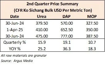China agreed to new contracts for standard grade MOP at $346 CFR for the remainder of 2025. India concluded at $349 CFR with 180 days credit. Annual contracts with India and China increased $66 per ton and $73 per ton, respectively, from 2024.